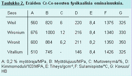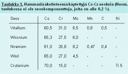 Cr-Co-seosten metallurgiaaCr-Co-seosten tyypillinen koostumus on Co 65 %, Cr 27,5 % ja Mo 6,0 %, jossa koboltin ja kromin vaihteluväli voi olla 1-5 %, joskus enemmänkin (ks. taulukko 1). Rakenne on p.k.k. Periaatteellisena vaatimuksena oli alunperin, että koboltin ja kromin suhde on noin 3:1. Koboltin korkean hinnan takia on kromin osuutta nostettu. Nykyään käytettyjen seosten koostumus vaihtelee jonkin verran. Tämä johtuu siitä, että halutaan korostaa joitakin erityisominaisuuksia. Erilaisia seosaineita käytetään ominaisuuksien parantamiseksi. Hammaslääketieteessä käytetyt seokset voidaan luokitella erkautumiskarkeneviksi. Kuitenkin kromi ja molybdeeni toimivat dispersiolujittajina. Raekoko on huomattavasti karkeampi kuin jalometalleissa valun jälkeen. Rakenne on dendriittinen. Seosten kovuus ja kulumiskestävyys perustuu pitkälti karbidien muodostumiseen. Valussa pyritään karbidien tasaiseen jakautumiseen rakenteeseen raerajoille ja mahdollisemman pieneen reakokoon. Karbidit muodostuvat 500°C ja 300°C lämpötilavälillä. Ne ovat Cr4C, Cr7C3 ja M6 C, jossa M on kobolttia, kromia tai molybdeenia. Karbidimuodostus on riippuvainen jäähdytysnopeudesta, joten paksummissa kappaleissa sisus voi olla hauraampi kuin ulkopinta. Tämän takia on tärkeää, että valukappale jäähdytetään nopeasti heti kovettumisen tapahduttua. On myös vältettävä paksuja rakenteita valukappaleessa. Koboltti (Z=27) on matriisimetalli, joka on rakenteeltaan heksagooninen (t.p.h.) alle 417°C:ssa. Tätä korkeammissa lämpötiloissa se muuttuu p.k.k.-rakenteiseksi. Sulamispiste on 1493°C. Kromi muodostaa Cr2O3 -passivoitumiskerroksen seoksen pinnalle, mikä estää korroosion. Kromin toinen tehtävä on estää koboltin allotrooppista muutosta. Kromi-koboltti-seos on austeniittinen. Nikkeli, jota tätä nykyä allergiariskin takia ei juuri käytetä, vähentää seoksen haurautta ja alentaa seoksen sulamispistettä. Se myös lisää seosten muovattavuutta. Molybdeeni lisää seosten kovuutta ja pitää rakenteen pienirakeisena. Se ei vaikuta muovautuvuuteen. Rautaa, kuparia ja berylliymiä voidaan lisätä, jos kovuutta halutaan nostaa. Beryllium laskee sulamispistettä. Mangaani ja pii suojaavat seoskomponentteja hapettumiselta sulatuksen aikana ja nostavat seoksen kovuutta. Titaania on lisätty jopa 5 %, mikä parantaa sulan reologisia ominaisuuksia. Titaania käytettäessä seoksessa ei saa olla hiiltä karbidimuodostuksen takia. Hiilen rooli on karbidimuodostus, joka lisää kovuutta. Sen enimmäismäärä on 0,5 %. Valun onnistumisen kannalta keskeisiä asioita ovat hiilettämisen ja hiilikadon estäminen jos sulatus suoritetaan liekillä sekä sulan ylikuumentumisen välttäminen. Sulatus voidaan suorittaa asetyleeni-happi- tai propaani-happi-liekillä mutta tämä vaati käyttäjältä tarkkaa hallintaa. Y.m. vaikeuksista johtuen valussa käytetään korkeataajuudella (1Mhz) toimivia sähköuuneja argon-suojakaasuatmosfäärissä tai vakuumissa. Ylikuumeneminen johtaa sekundäärikarbidien muodostukseen raerajoilla ja suureen raekokoon, joka taas lisää rakenteeseen haurautta. Lämpölaajeneminen on sulamispisteen lähellä 2,3 %, joka on huomattavasti suurempi kuin jalometalleilla (vertaus tehdään jalometalleihin, sillä ne ovat hammaslääketieteessä käytetyimmät). Tämä johtaa hitsauksessa helpommin halkeamiin. Lämpökäsittely ei vaikuta kobolttiseoksiin kovin paljon vaikkakin jonkun asteista vanhenemista voidaan havaita johtuen sekundäärikarbidien muodostumisesta. Lämpökäsittely voidaan suorittaa suojakaasuatmosfäärissä 700°C ja 1200°C lämpötila-alueella. Toisaalta nämä seokset ovat kaikki hyvin työstökarkenevia. Työstöhehkutusta voidaan käyttää hitsauksen jälkeen lähinnä sisäisten jännitysten purkamiseen. Kobolttiseosten lämmönjohtavuus (n.27 W/mK) on huomattavasti alhaisempi kuin terästen (45 W/mK). Niiden lämmönjohtavuus nousee lämpötilan mukana. Hitsausta ajatellen lämpövyöhyke on kapeampi kuin teräksillä. Muita fysikaalisia ominaisuuksia on kerätty taulukkoon 2 /1,2,3/.